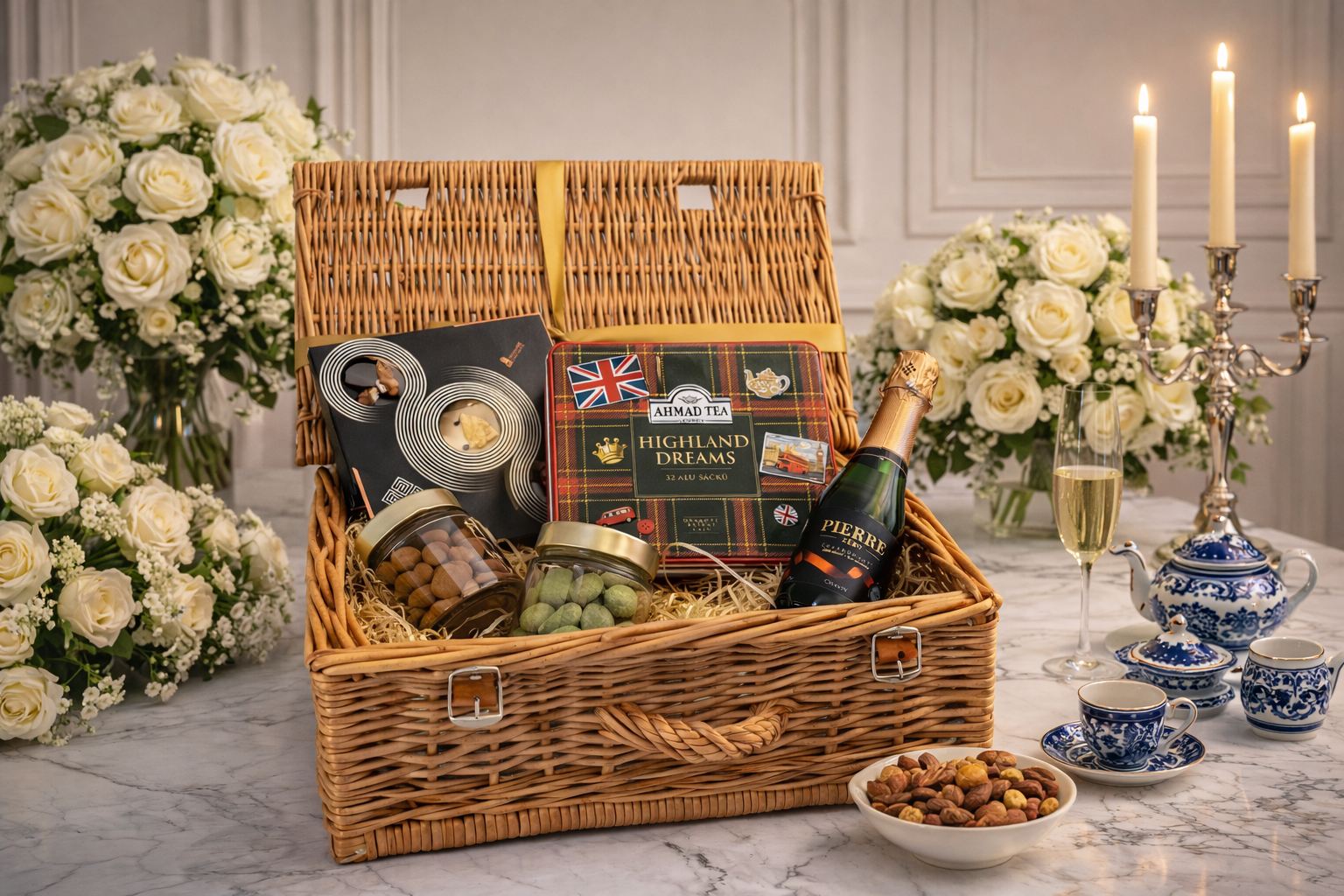 It’s no surprise that For the Jubilee is one of our most popular gift baskets. This hand-knitted picnic basket, tied with a gold ribbon, contains a selection of premium teas, Slovak honey, delicious cookies, coffee, and nuts. An elegant gift that will delight anyone.